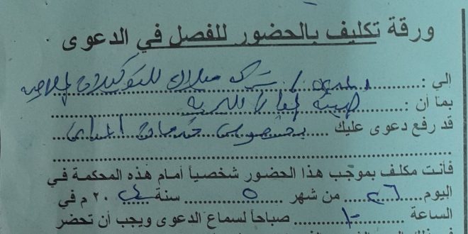 فأنت مكلف بموجب هذا الحضور شخصياً أمام هذه المحكمة في اليوم 26 من شهر 5 سنة 2024م في الساعة 10 صباحاً لسماع الدعوى ويجب أن تحضر في ذلك اليوم الشهود الذين تعتمد على شهادتهم و جميع المستندات التي تنوي الاعتماد عليها تأييداً لدفاعك و عليك ان تعلم أنه في حالة عدم حضورك في اليوم المذكور تسمع الدعوى ويفصل فيها في غيبتك .